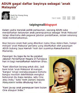 Hannah Yeoh seorang wakil rakyat DAP yang menang dalam PRU 2008 di Selangor. Beliau telah berkahwin dengan seorang lelaki India dan baru-baru ini telah melahirkan seorang anak. Dari segi logik yang biasa kita ketahui, taraf bangsa akan mengikut suami. Oleh itu sebutan bangsa ataua keturunan mestilah bertulis India. tentang agama terpulanglah kepada Hannah Yeoh , naj tulis Buddha, Kristian atau Hindu terpulang kepada beliau kerana ia sudah termaktub dalam perlembagaan persekutuan negara.